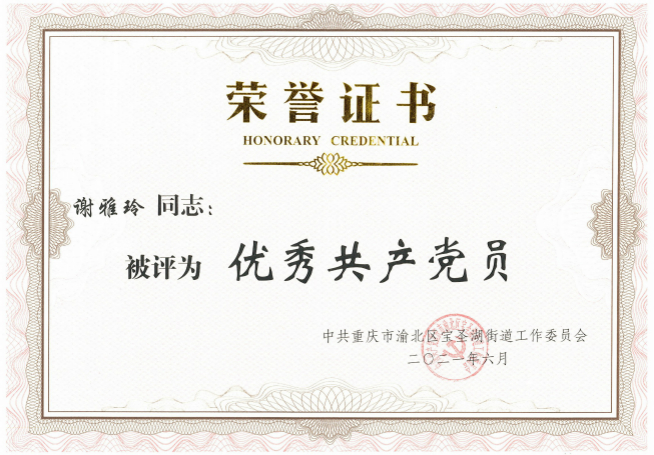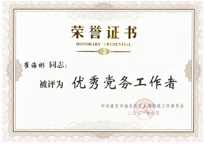 近日,乐动买球党支部荣获渝北区宝圣湖街道“先进基层党组织”荣誉称号,支部谢雅玲同志获评“优秀共产党员”,崔海彬同志获评“优秀党务工作者”。