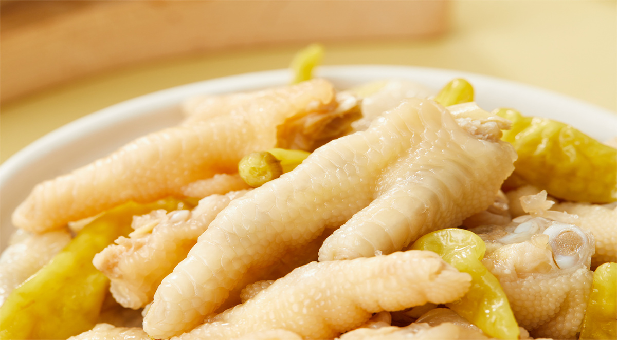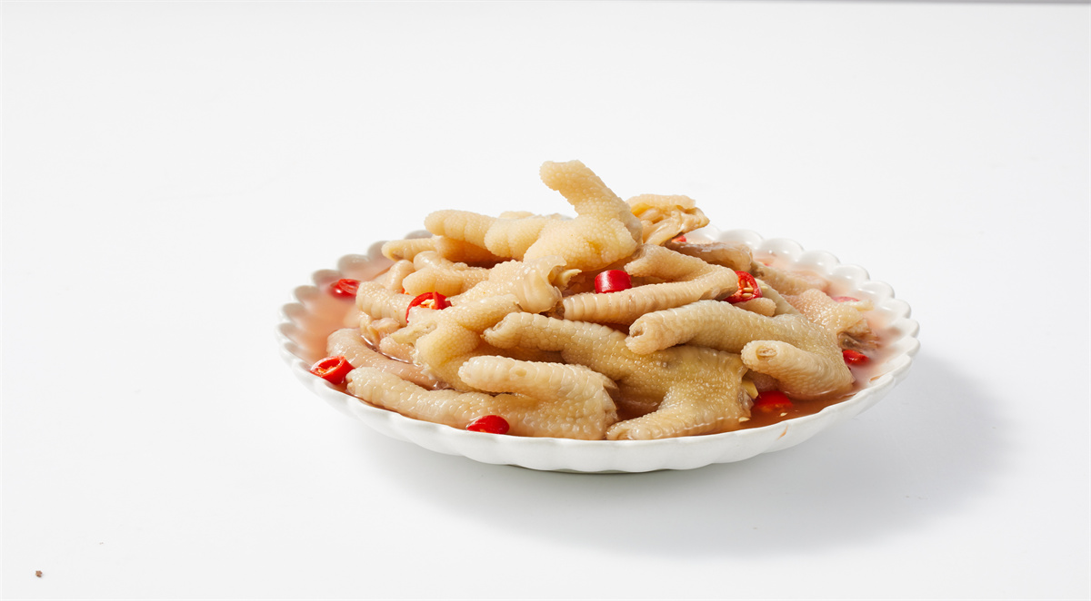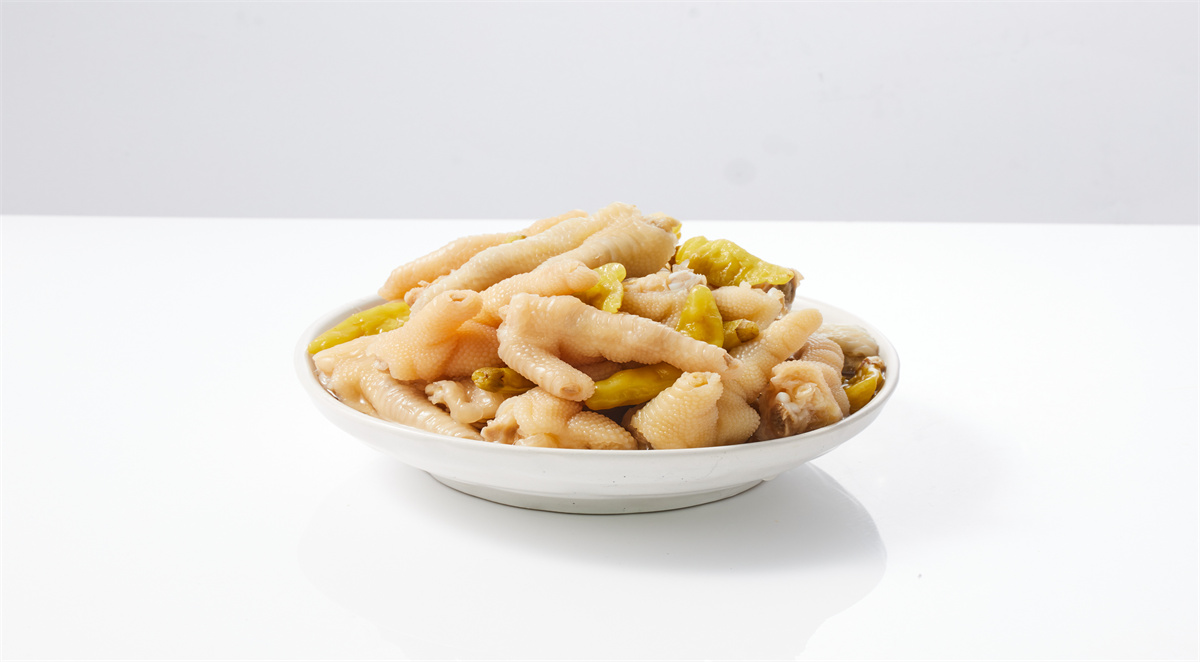 特点:以优质鸡爪为原料, 选用复合乳酸菌种与天然香料,通过人工 控制发酵方法泡制而成。产品色泽美观, 香辣纯正,略带乳酸,鸡肉的鲜香与泡菜 的爽脆相结合,好吃又开胃。